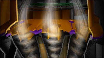 14 циклонов создают центробежную силу до 100 000 g для удаления пыли и грязи из воздушного потока без потери всасывания.