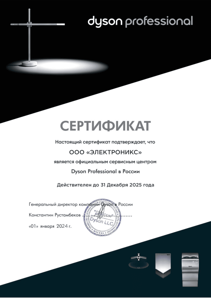 ООО «Электроникс» – ваш надежный партнер в мире инновационных технологий! Мы гордимся тем, что являемся официальным и сертифицированным партнером ведущего производителя бытовой техники Dyson.